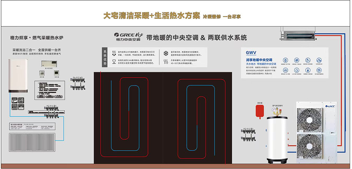 空調(diào)、地暖雙水系統(tǒng)設(shè)計(jì)一機(jī)兩用制冷時(shí)如深山中的自然清涼而不干燥采暖時(shí)足暖頂涼更養(yǎng)生風(fēng)柔水潤(rùn)。