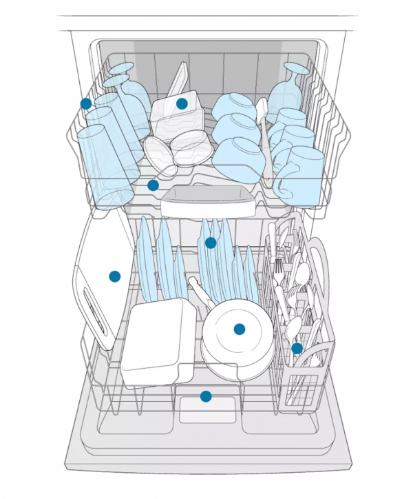1.上碗籃適用于放置較小和細長的餐具,如小碗、碟子、飯勺、較高的玻璃杯等;下碗籃可以放置大碗、湯碗、餐盤、平底鍋、及其他盆和盤等;合理利用刀叉籃,還能更大程度利用儲放容量,使餐具有足夠的空間以保證徹底洗滌。